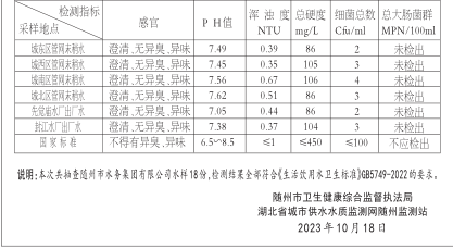 湖北省城市供水水質(zhì)監(jiān)測網(wǎng)隨州監(jiān)測站、隨州市衛(wèi)生健康綜合監(jiān)督執(zhí)法局根據(jù)《城市供水水質(zhì)管理規(guī)定》聯(lián)合于2023年10月17日對隨州市水務(wù)集團有限公司先覺廟水廠和封江水廠出廠水和16個管網(wǎng)末稍水水質(zhì)進行了抽樣監(jiān)測,現(xiàn)將抽查檢測結(jié)果公告如下: