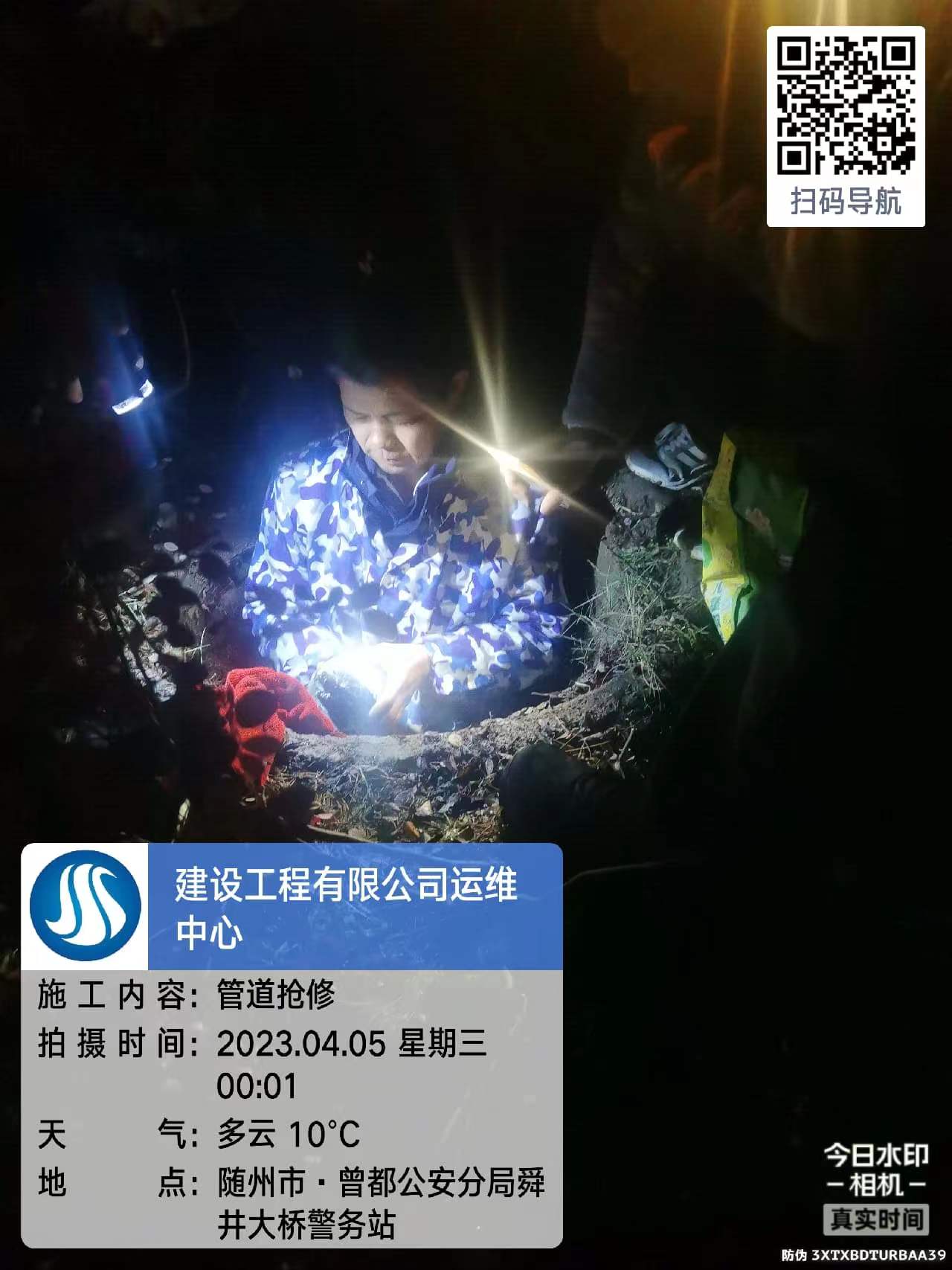 夜幕里,在探照燈燈光的照射下,為盡快修復供水管道,縮短停水時間,敲、拆、補、焊、聽......搶修隊伍一刻不停,緊張地忙碌著。夜晚春風微涼,他們的衣服被汗水浸透卻也渾然不覺。經過連續(xù)3個多小時的奮戰(zhàn),搶修人員終于在翌日凌晨三點半順利修復了破損管道,恢復了通水,圓滿完成了搶修任務!