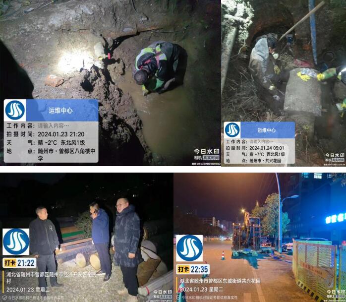 1月23日,有市民反映鐵路片區(qū)下坡處地面有積水,附近有學(xué)校,周邊住戶也較多,對市民出行造成極大安全隱患。測漏人員第一時間到場勘查,排查后發(fā)現(xiàn)漏點在下坡處拆遷區(qū)內(nèi),工作人員及時與當?shù)厣鐓^(qū)居委會和相關(guān)部門取得聯(lián)系,經(jīng)過多方協(xié)調(diào),滿足施工條件后,立即組織搶修隊伍進行開挖,在寒風凜冽的深夜,搶修人員爭分奪秒,全然顧不上他們已凍得通紅的雙手,只希望以最快速度完成改造作業(yè),最大程度減小停水作業(yè)對居民的影響。當晚21點25分歷時3小時將DN100管道漏水點搶修完畢,保障了極寒天氣下周邊居民、學(xué)生出行的安全。