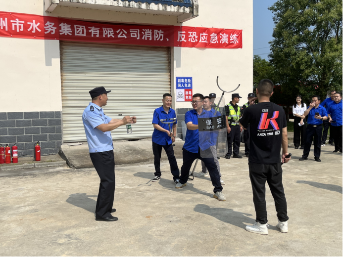 在反恐演練環(huán)節(jié),隨縣公安局民警首先為大家講解了盾牌、鋼叉等各種反恐防暴器具的使用方式和技巧?,F(xiàn)場模擬一名“歹徒”持斧闖入封江水廠,防暴大隊(duì)民輔警快速響應(yīng),針對現(xiàn)場情況,果斷采取有效措施,運(yùn)用盾牌、鋼叉等防爆器械,針對“歹徒”的各類暴力情形,采用三角隊(duì)形進(jìn)行靈活處置,成功將“歹徒”制服。隨后,在民警指導(dǎo)下,市水務(wù)集團(tuán)應(yīng)急救援隊(duì)開展了模擬反恐演練。