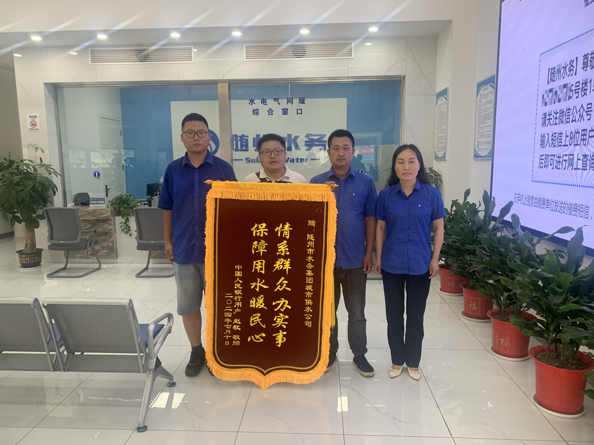 近日,中國人民銀行用戶將一面繡有“情系群眾辦實事 保障用水暖民心”的錦旗送到隨州市水務集團城市供水公司共享營業(yè)廳。感謝運維中心維修人員急用戶之所急、憂用戶之所憂、真心為用戶考慮,解決其用水問題。