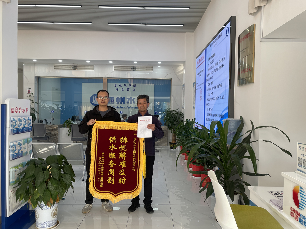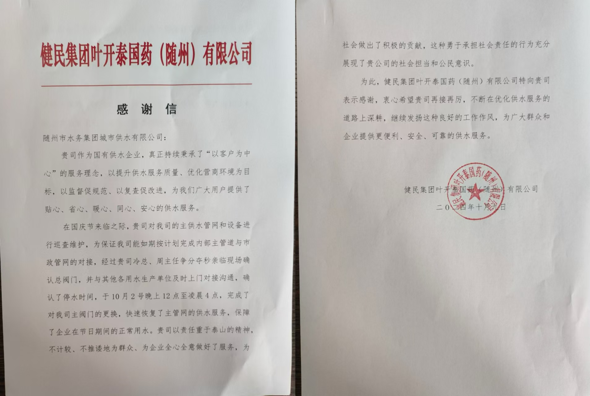 “排憂解難及時(shí) 供水服務(wù)周到”,近日,健民集團(tuán)葉開泰國藥(隨州)有限公司專程到隨州市水務(wù)集團(tuán)下屬子公司城市供水有限公司送上一面承載誠摯謝意的錦旗和一封感謝信,他們用最質(zhì)樸、最真摯的方式,對(duì)公司運(yùn)維人員熱情、高效、便捷、暖心的服務(wù)表示誠摯感謝。