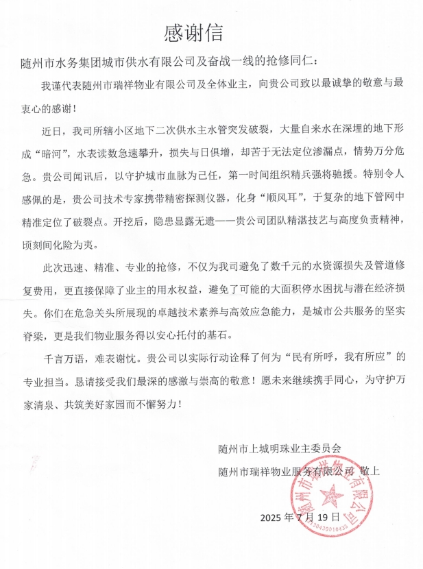 7月19日,上城明珠小區(qū)業(yè)委會與瑞祥物業(yè)的代表滿懷感激,將一面繡有“排憂解難、水域神探” 的錦旗和一封情真意切的感謝信送到城市供水公司,以此表達全體業(yè)主對城市供水公司的誠摯謝意。“若不是有你們團隊的精湛技藝與高度負責精神,我們的損失不堪設(shè)想!這面錦旗雖輕,卻裝著全體業(yè)主的滿心感激!” 代表們緊握工作人員的手,話語間滿是動容。