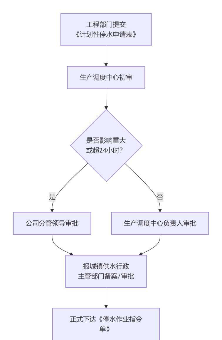 內部審批:調度中心對停水的必要性、時長和范圍進行初審。影響范圍廣或停水時間預計超過24小時的重大作業(yè),需報公司分管領導批準。