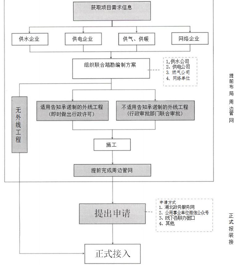 5. 全面實(shí)現(xiàn)網(wǎng)上可辦。 依托湖北政務(wù)服務(wù)網(wǎng),實(shí)行企業(yè)網(wǎng) 上申請、資料線上傳遞、行政部門線上審批的全流程網(wǎng)上聯(lián)動(dòng)報(bào)裝模式。